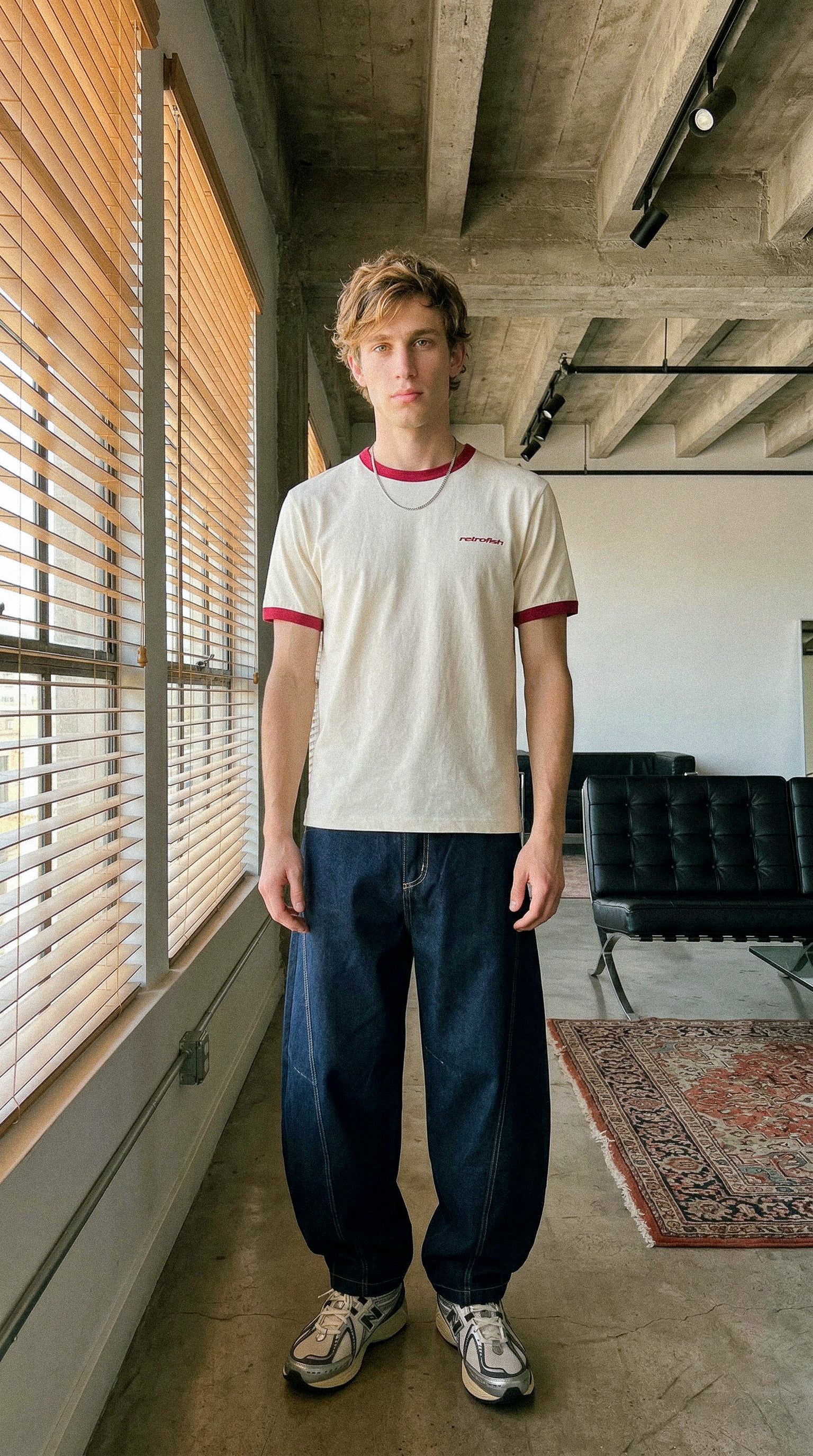 Color Tela: Crudo con mangas y cuellos en rojo.