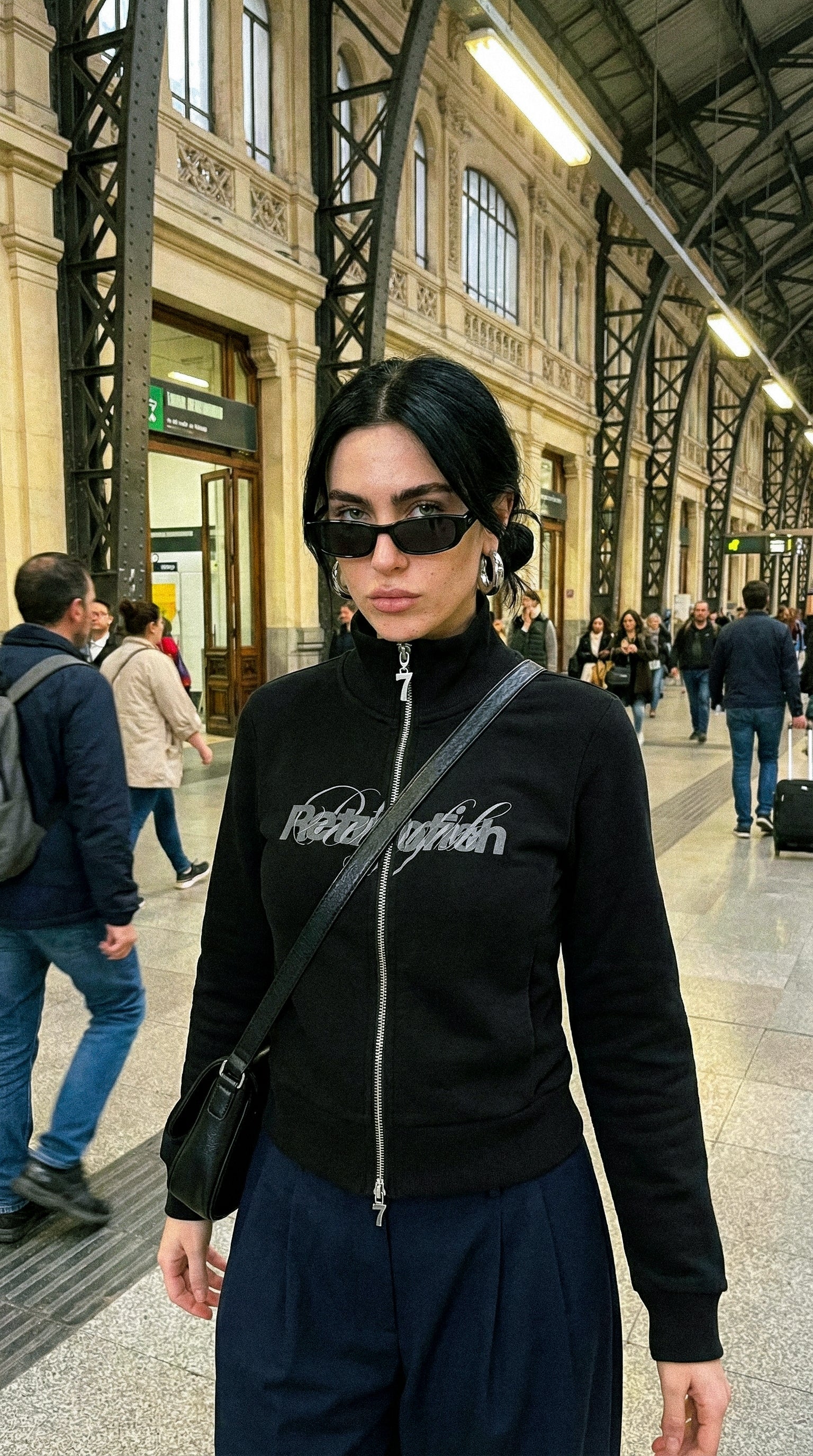 Buzo de mujer con cierre completo con cuello y cintura alto en ribb. Confeccionado en frisa premium. Corte entre boxy y oversize. Color negro estampa doble Retrofish.